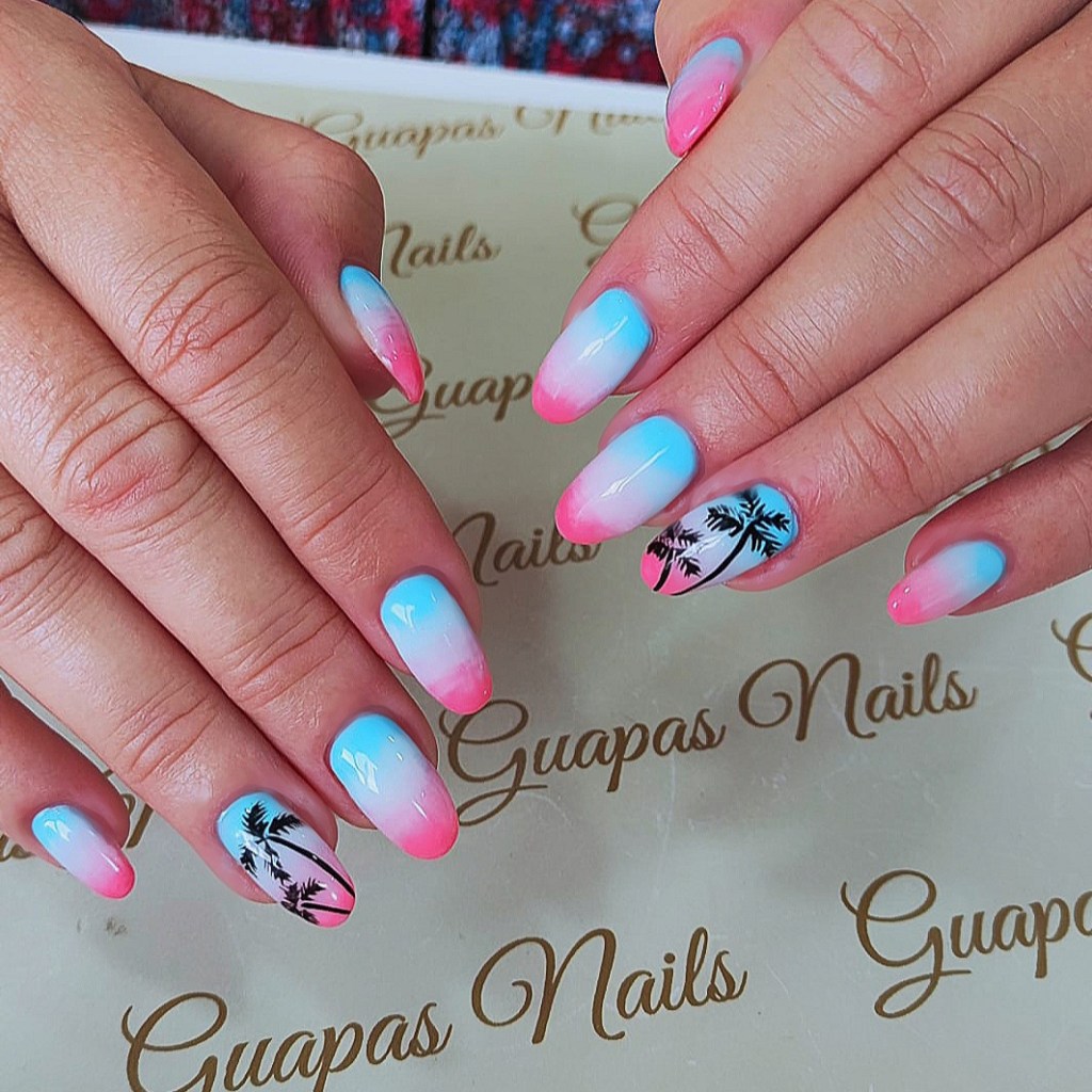 Es una elegante manicura francesa en efecto degradado entre el rosa y el blanco de la uña.